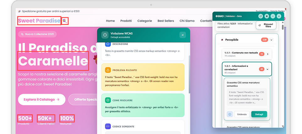 EQUO Validator è uno strumento avanzato che ti permette di vedere direttamente sulle tue pagine web dove e come migliorare l’accessibilità.